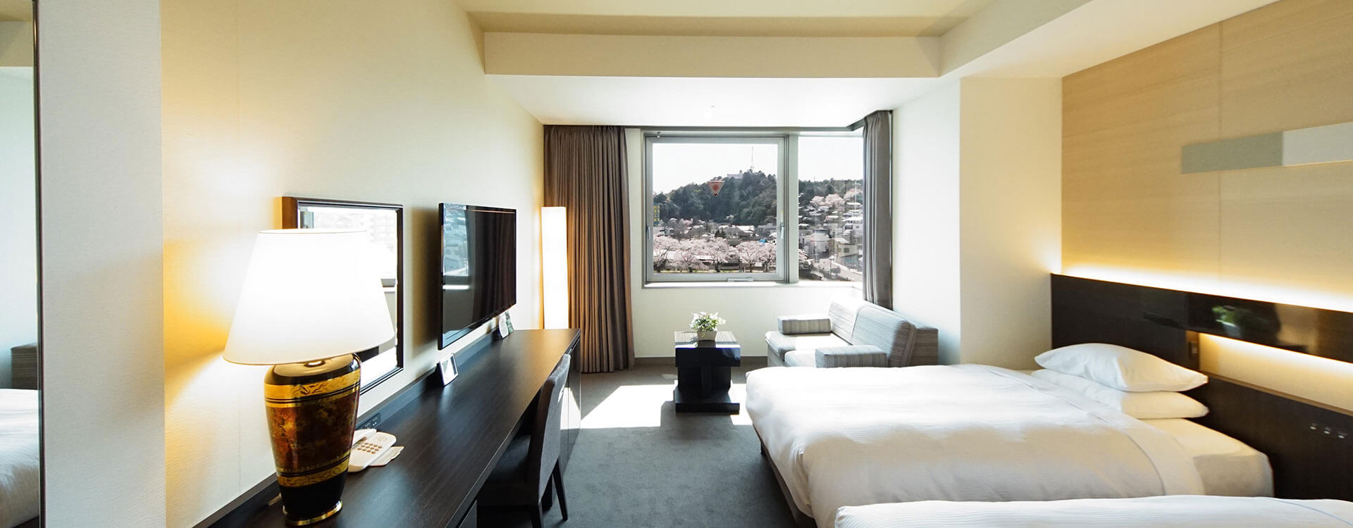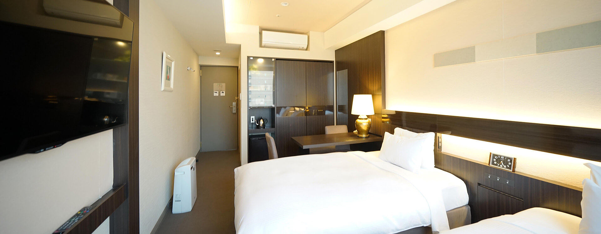 当ホテルで最も標準的なお部屋タイプ。適度な広さに使い勝手の良い机や大きなテレビなどお一人からご家族までご利用いただけます。お部屋の種類は、「ツイン」と「親子ベッドルーム」。2台の大人用ベッドの他に机をはずして少し小さな子供用ベッドを入れた「親子ベッドルーム」は、ベッドの隙間がなくて安心と、乳幼児連れのご家族に人気です。「ツイン」のお部屋についても、2台のベッドを合わせハリウッドツインまたはダブルとしてご利用いただけます。