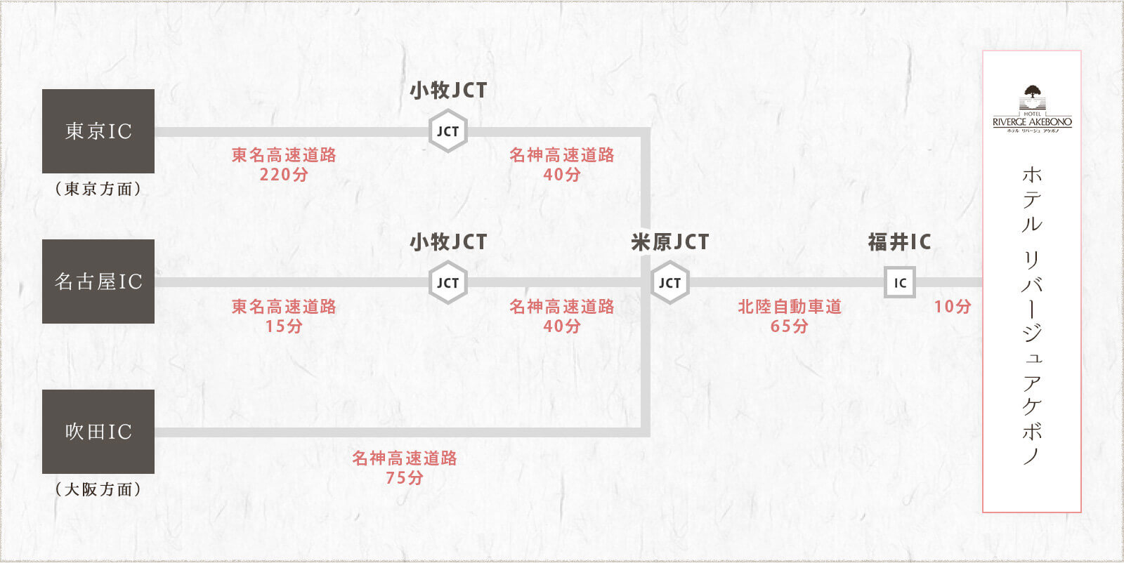 福井ICを降りてから、左の福井市街方面へ出て158号線に入ります。ここから約10分です。