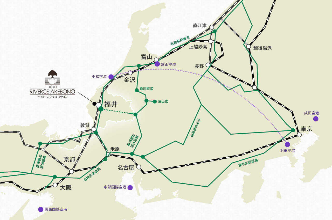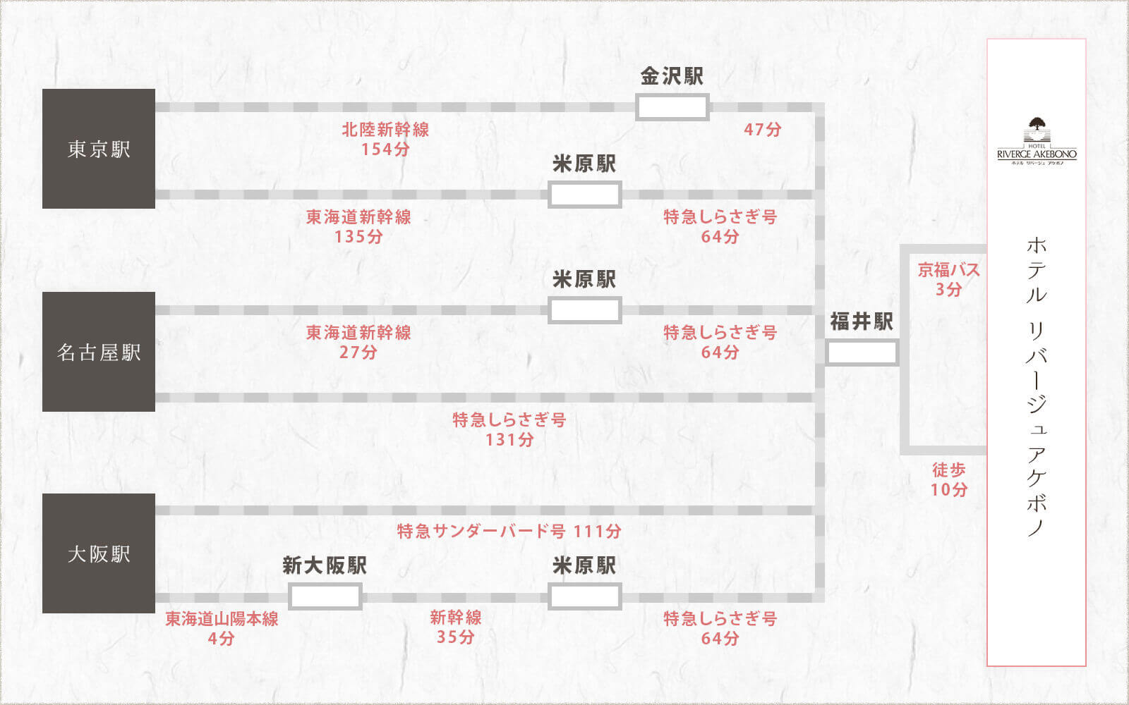 下記の京福バスサイトのボタンからGoogleMapで、「福井駅→ホテルリバージュアケボノ」にて検索し、「片町入口」で降りると便利です。