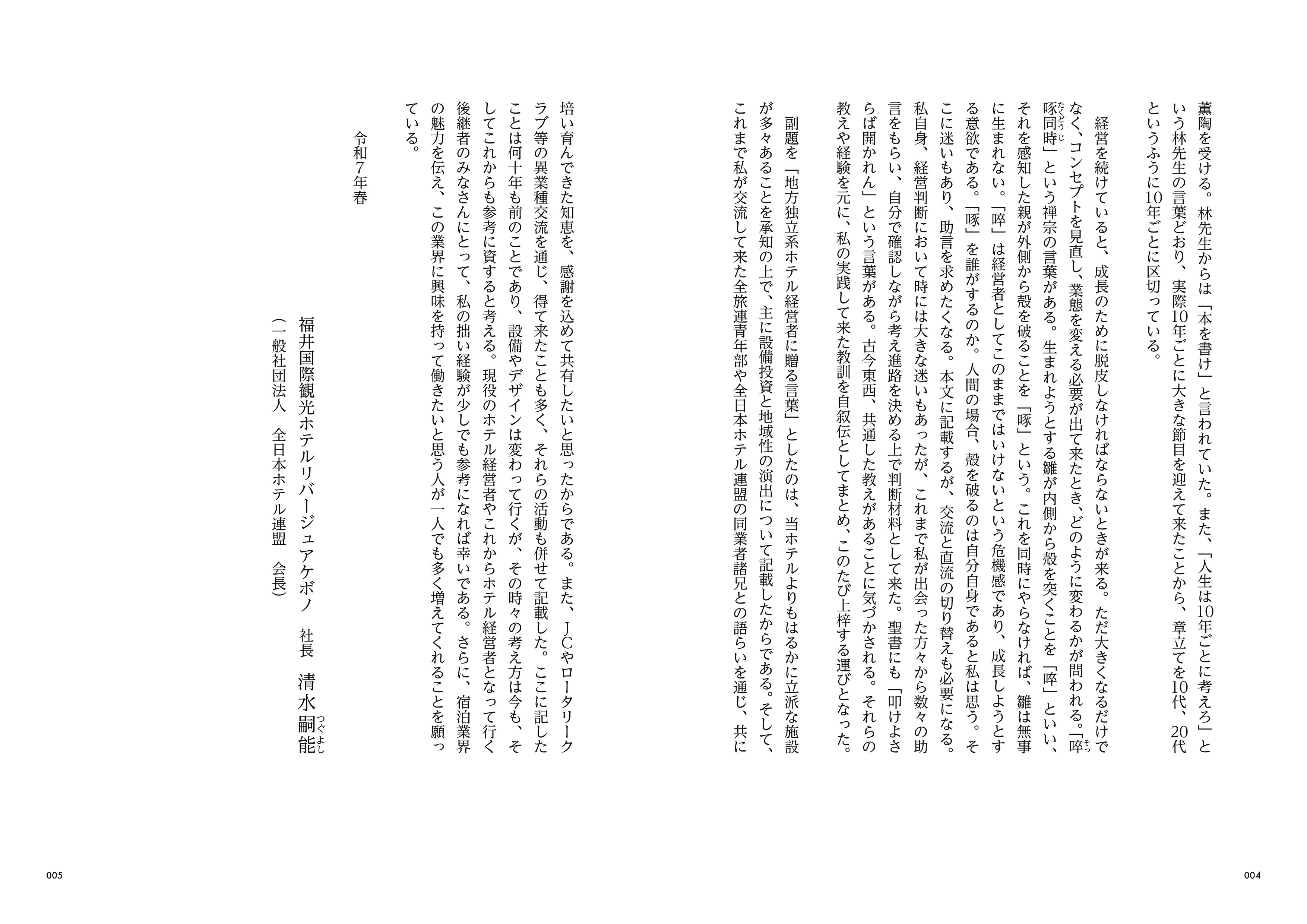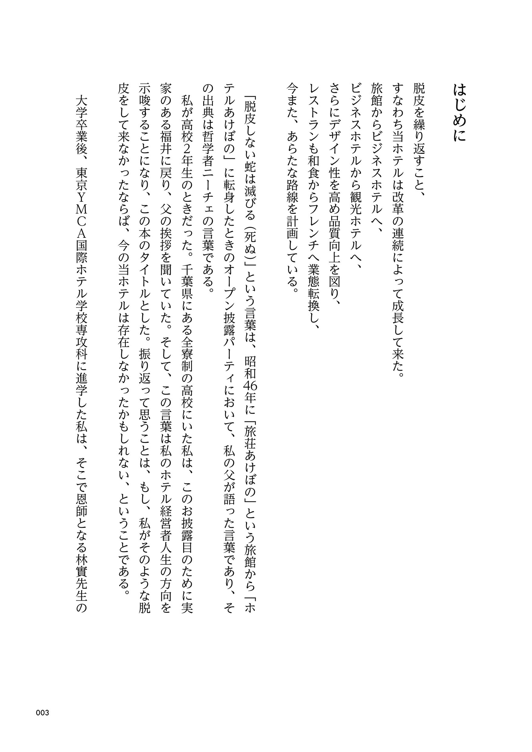 ホテルリバージュアケボノ 社長 清水嗣能の著書である『脱皮しない蛇は滅びる 地方独立系ホテル経営者に贈る言葉』が発刊されました。 Amazonや福井市内の勝木書店でもご購入いただけますが、当ホテル売店でも販売しています。1,980円